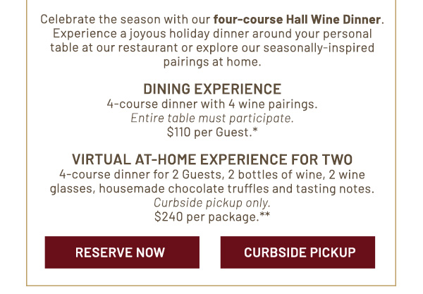 **Price excludes tax and gratuity. Hall virtual at home experience not available in Scottsdale, AZ; DC Ranch, AZ; Chandler, AZ; Peoria, AZ; or Salt Lake City, UT. Available only for curbside pickup or delivery where allowed by law. Guests may substitute wine pairing with a non-alcoholic beverage.