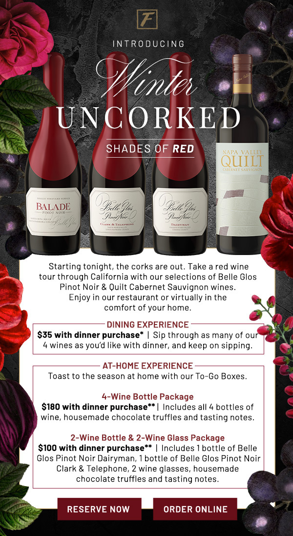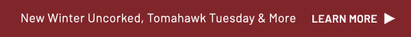 **Price excludes tax and gratuity. Uncorked 2 and 4 Bottle To Go Boxes available for curbside pickup and delivery where allowed by law. Uncorked 2 and 4 Bottle To Go Boxes must be ordered with dinner purchase. Uncorked 2 and 4 Bottle To Go Boxes not available in Scottsdale, AZ; DC Ranch, AZ; Chandler, AZ; Peoria, AZ; Birmingham, AL; Salt Lake City, UT. Uncorked 4 Bottle To Go Box not available in Providence, RI.