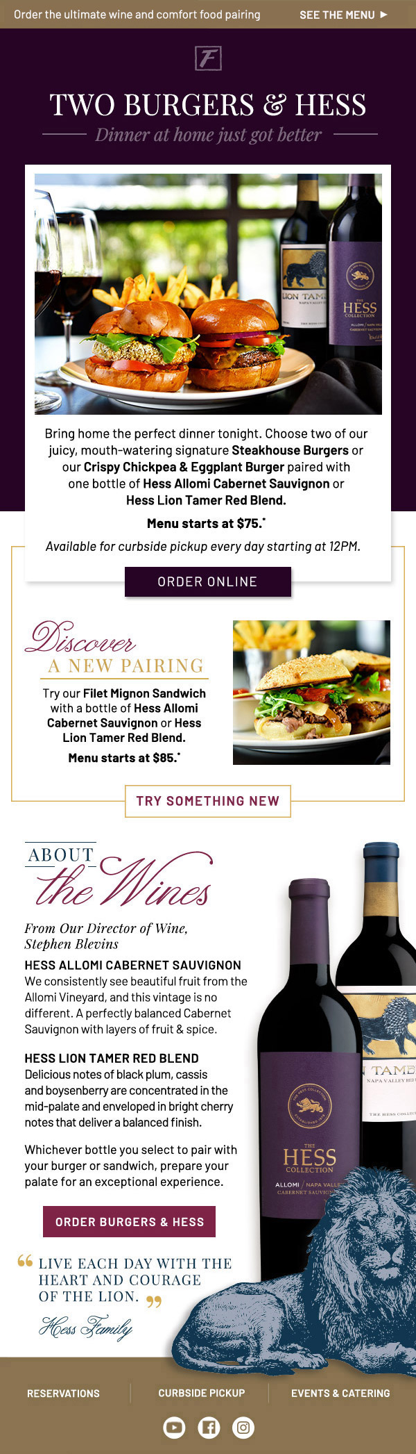 *Price excludes tax and gratuity. Two Burgers & Hess not available in Scottsdale, AZ; Chandler, AZ; Scottsdale DC Ranch, AZ; Peoria, AZ; Atlanta, GA; Radnor, PA; or Salt Lake City, UT. Available for curbside pickup only. Available for delivery only where allowed by law. A non-alcoholic beverage may be substituted in place of the wine.