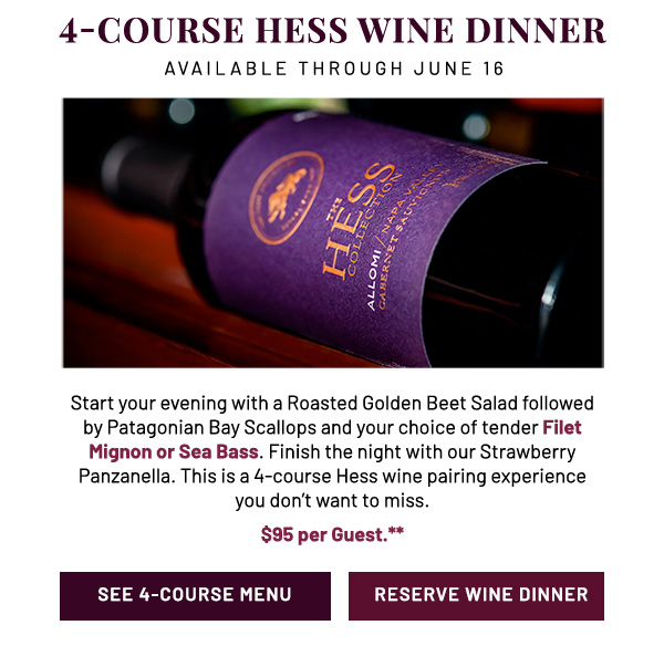 ** Wine Dinner available through 6/16/21. Dining experience for the table available in restaurant or for outdoor dining only. Entire table must participate. Not available in Salt Lake City, UT. Guests may substitute wine pairing with a non-alcoholic beverage. Price excludes tax and gratuity.