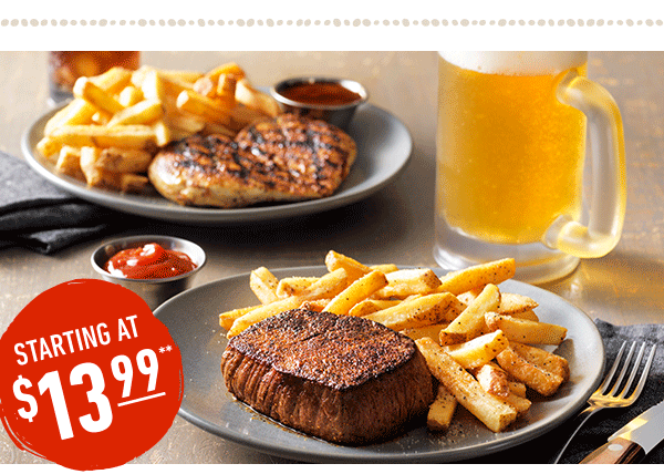 **Available for dine-in on Wednesdays only. Limited time offer. Prices and participation may vary. Beer offer void where prohibited by law. Offer not valid at restaurant locations in the states of AK, AZ, CA, CO, ID, MN, MS, MT, NM, NV, OR, SD, TN, UT, WA & WY, plus all airport locations. Beer offer not available at restaurant locations in AR, HI, PA & UT. Beer is a non-craft domestic draft only. Drink responsibly. This material is intended only for those of legal drinking age. Please do not forward to or share with anyone under 21.