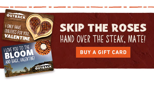 Prices, product participation, restaurant hours, wait list availability and delivery services will vary by location. Update your preferred restaurant location here to receive news specific to your favorite Outback. *Offer available 2/10/2025 - 2/16/2025 only at participating locations. Meal available for dine-in, Curbside Take-Away® and Outback delivery. Offer not available for third-party delivery. Prices, products, participation and restaurant hours vary by location. Not available at some locations in Arizona, California, Colorado, Mississippi, New Mexico, Nevada and Tennessee. Not valid in conjunction with any other offer, discount or coupon. No substitutions. Tax, gratuity and beverage not included. Dine Rewards points expire 6 months and rewards expire 90 days after the date on which they are earned. Rewards can be used to cover the cost of food or non-alcoholic beverages. Alcohol, gift card purchases, catering, delivery fees, third party orders, discounts, taxes and tip are excluded. Earn 5 points for every dollar spent on food and non-alcoholic beverages. No partial points will be awarded and no partial redemptions will be allowed. Prices, product participation and restaurant hours may vary by location. Not valid in conjunction with any other offer, discount or coupon. Other restrictions may apply. Void where prohibited by law. Visit dine-rewards.com for full program details. Void where prohibited by law. Update Preferences | Unsubscribe | View Online | Privacy Policy This email is sent from an account we use for sending messages only. So if you want to contact us, don't reply to this email – we won't get your response. Instead use this web form . Outback Steakhouse - 2202 N. West Shore Blvd. Suite 500 Tampa, FL 33607